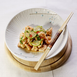 Gamberi*, zenzero, filetti di carote, riso, salsa teriyaki