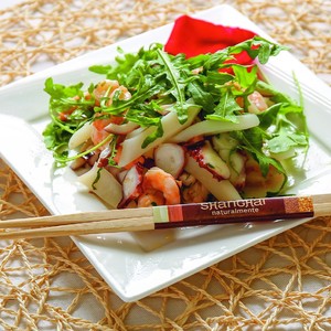 spaghetti di soia*, cipollotto, Farina di grano*, zenzero, salsa di soia, surimi di ganchio*