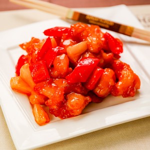 Gamberi*, farina di grano, peperoni, cipolla, ananas, sciroppo di arancia e frutta di passione, semi di sesamo