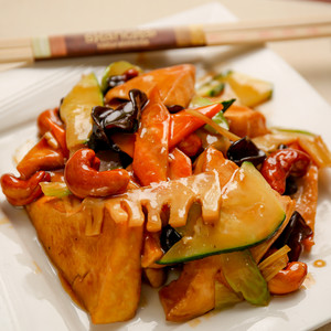 Toufu, carote, funghi agarici, anacardi, zucchine, germogli di bambù,